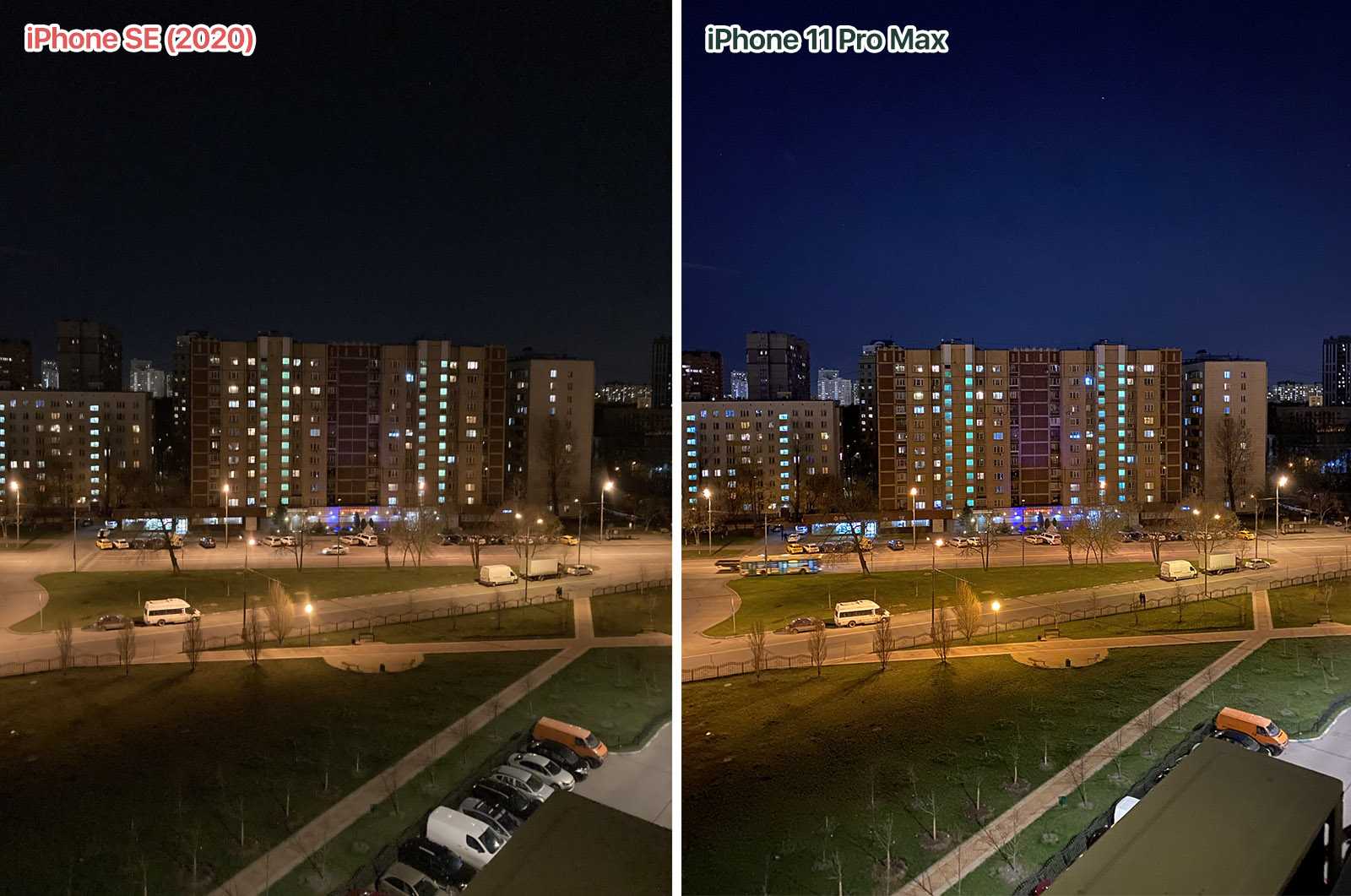 Снято ночью на заднюю камеру iPhone SE (2020) и основную заднюю камеру iPhone 11 Pro Max